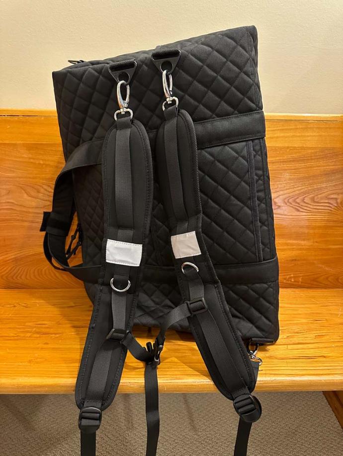 Brad also requested backpack straps so that he could walk through the airport with the duffle on his back and a coffee in one hand and his phone in the other hand. (I purchased the actual black backpack straps from Amazon.) The rest of the bag is all ByAnnie! I added my own personalized tags, too. I also added a wrap around strap to hold the handles together when it is in "backpack mode".
