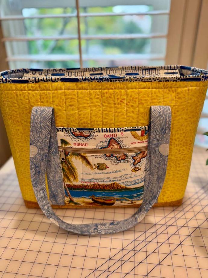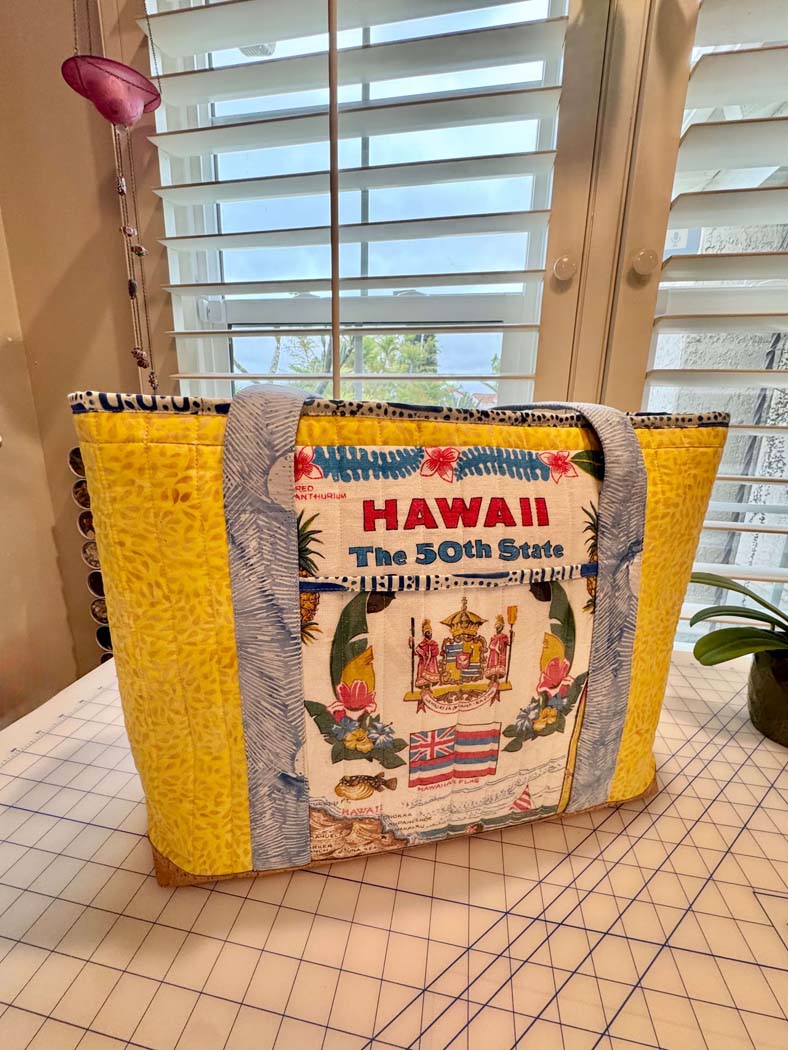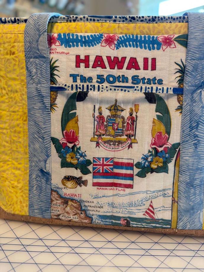 This was the perfect project and a gift for a dear friend who loves Hawaii. The vintage tea towel incorporated into the product is from the 1960’s. I had to ponder placement and piecing to get the graphics out of the towel that I liked, which is why I decided to make the outside slip pocket in clear vinyl.