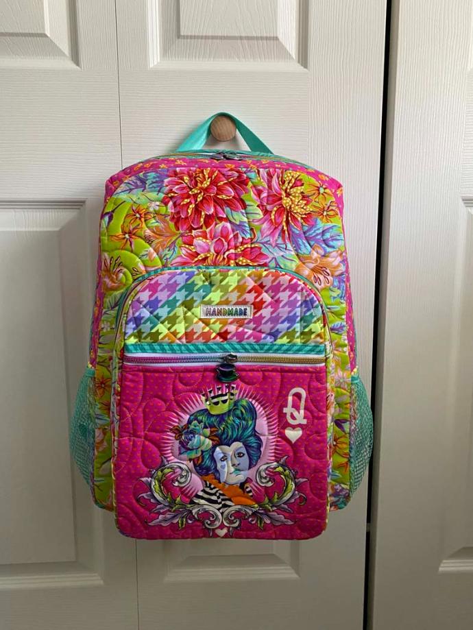 Jennifer (Instagram: @taughtbymomquilts) made her lovely Leader of the Pack with Tula Pink’s Nightshade Deja Vu line, and did an amazing job fussy cutting the cameo for the front pocket!