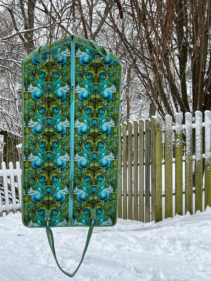 WHAT WE LOVED: We loved how beautiful this garment bag looked hanging out in the cold snow. One team member said, "I love that she hung a bag with squirrels on the fabric on the fence!"