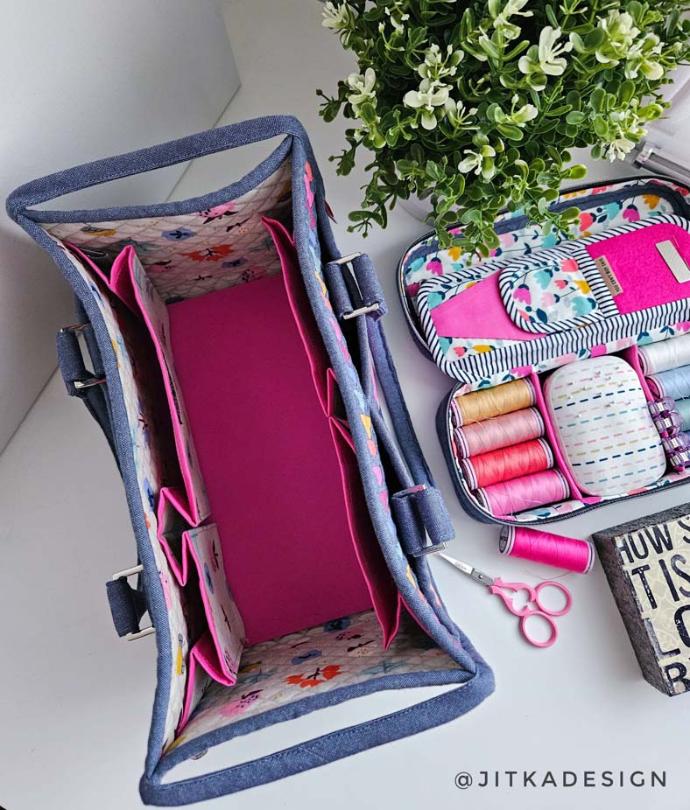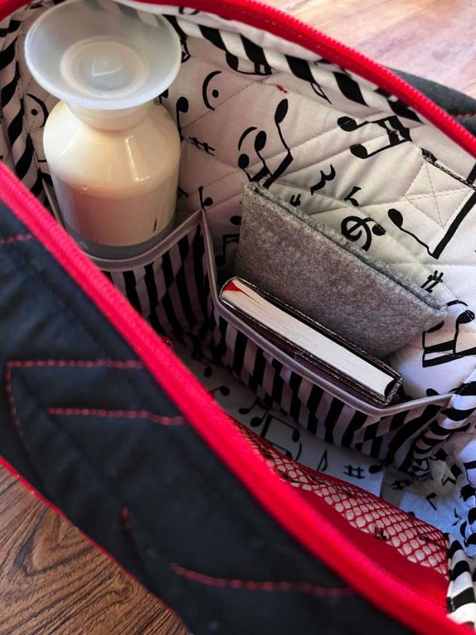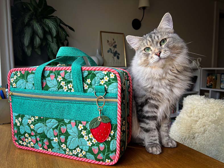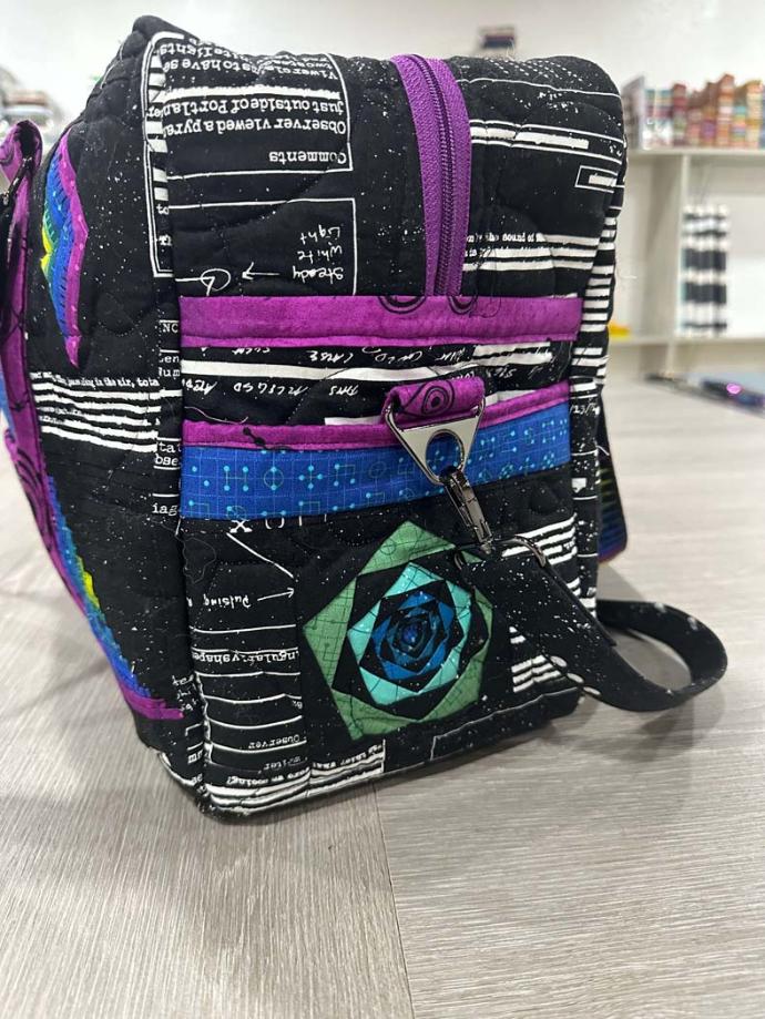 I really appreciate the choice of coordinating fabrics for the inner pockets and lining to bring the outside FPP and applique fabric colors into the interior of the bag. The pop of pink fabric in the binding and base stabilizer sleeve is the cherry on top. Clearly there was intentional planning in this project and it is a fabulous, functional finish!