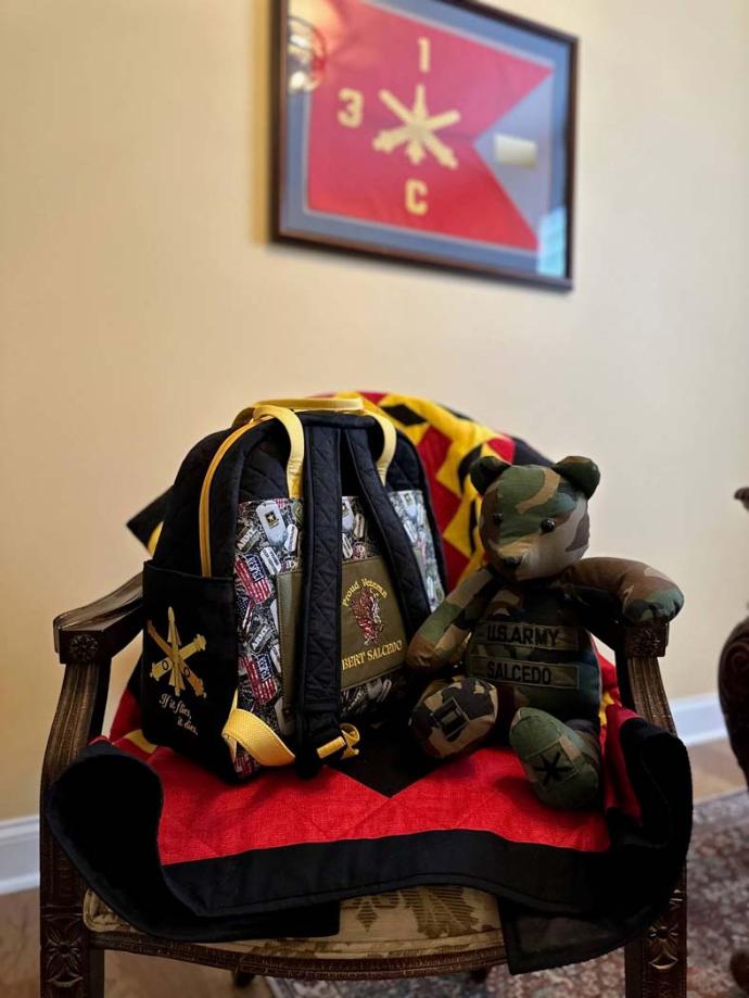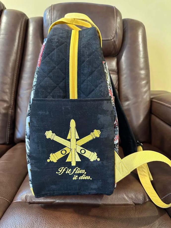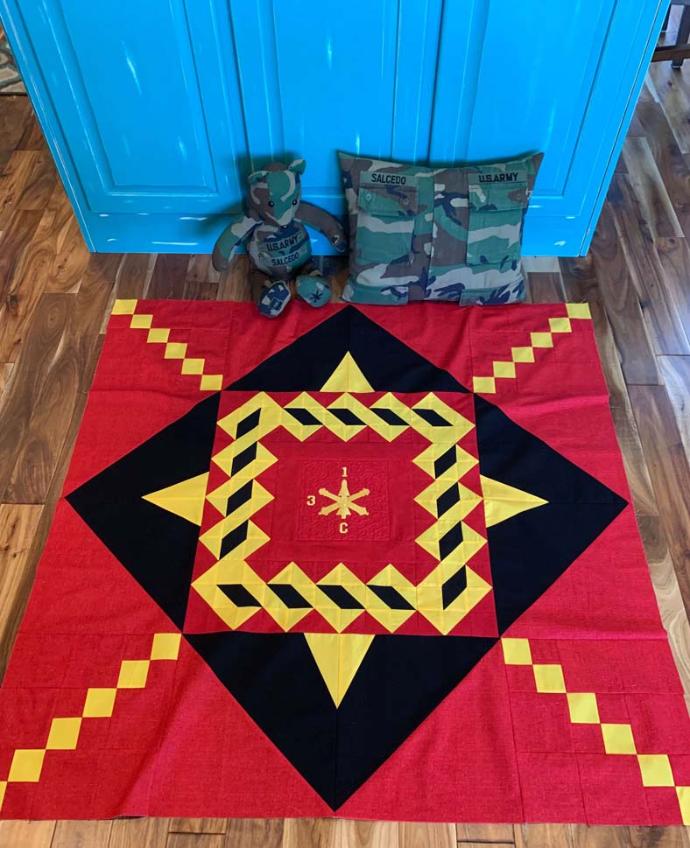 I wanted to make it unique to him by adding some embroidery designs on the pockets (to match his company guidon for the unit he was a commander) and his name on the luggage sleeve so everyone would know that is his bag. I have also made him a memory bear and pillow with his old BDUs (Battle Dress Uniform) which he loves and a quilt that I designed to go in his office to mimic his guidon flag.