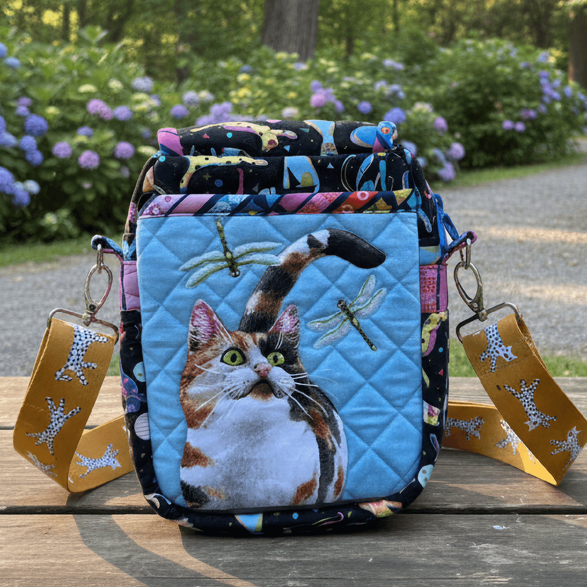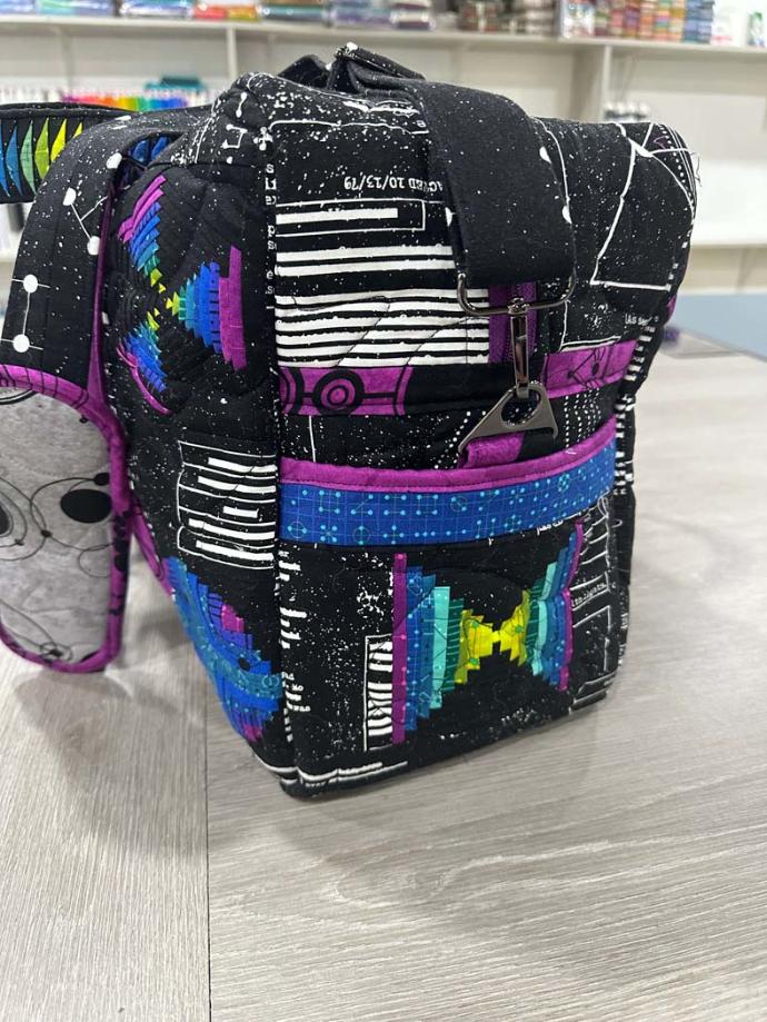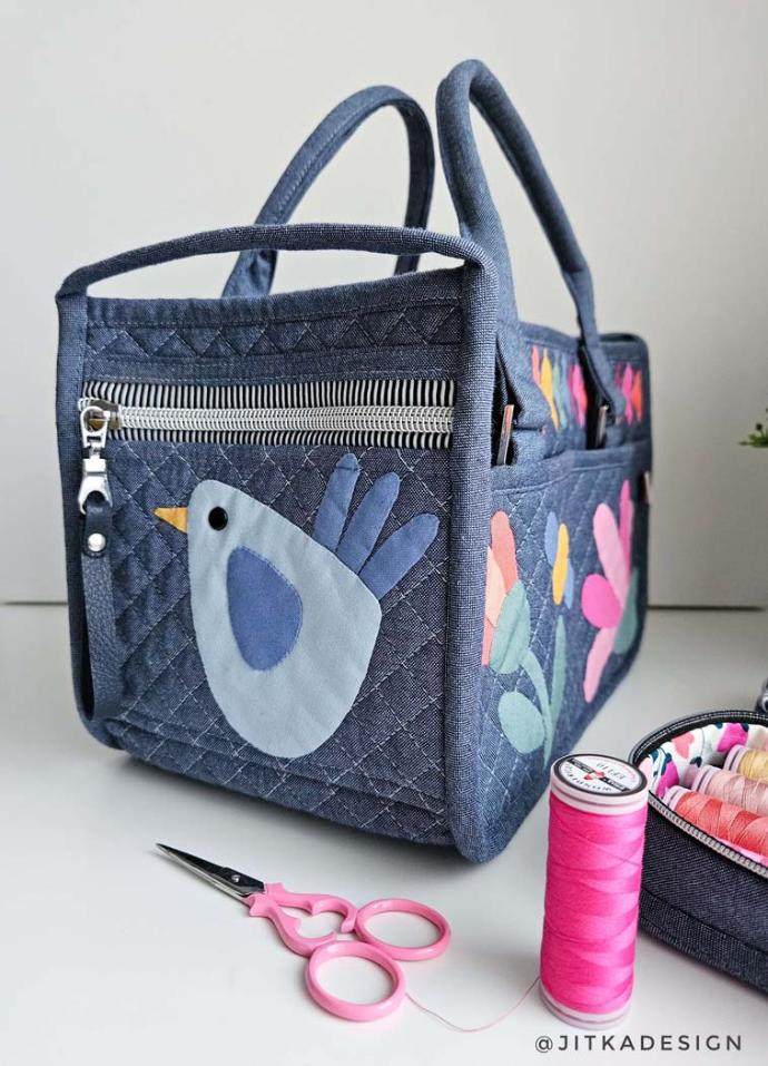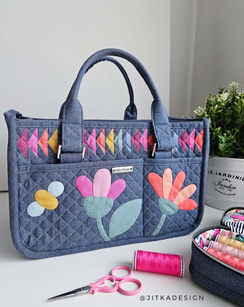 WHAT WE LOVED: Elissa had this to say, " I love everything about Jitka's "In Control" bag - it is the perfect combination of creative design elements including the flying geese style 1 pattern from my Bella Accent Sleeves Expansion Pack! Jitka's fabric selection to show off the foundation paper piecing and applique on the background fabrics was just right to celebrate the designs and her skills. Down to the thoughtful color of thread to really show off the quilting design in her bag - there was no detail left untouched.