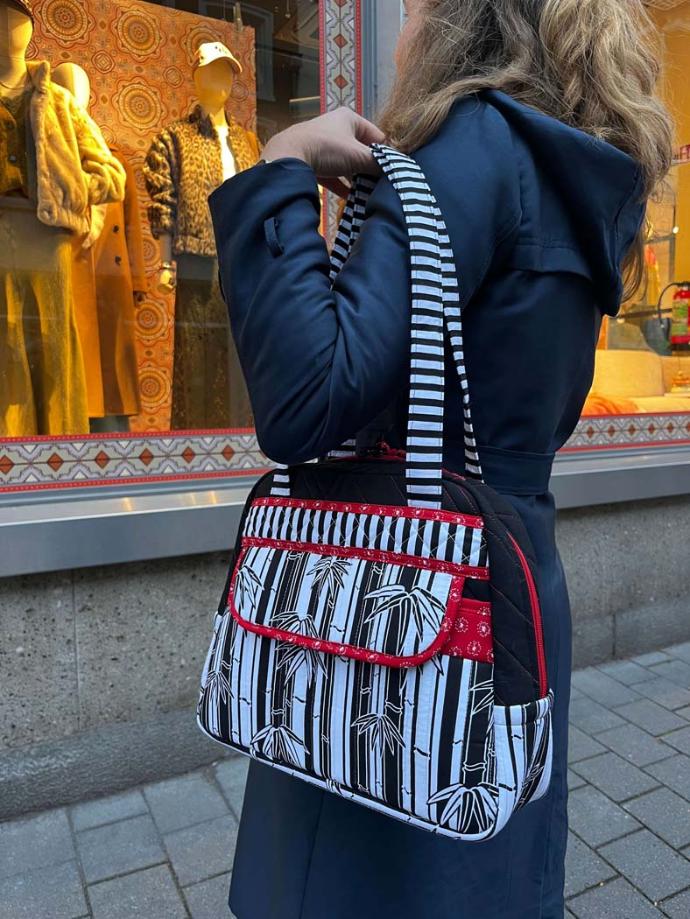 THEIR STORY: My stepmother always likes black and wite, so I dove into my stash to make her a bueatiful black and white handbag with a touch of red. A very nice size handbag for a walk in the city or going out for drinks ;-).