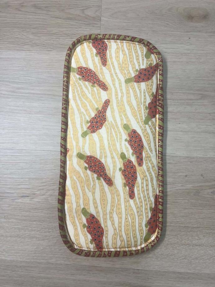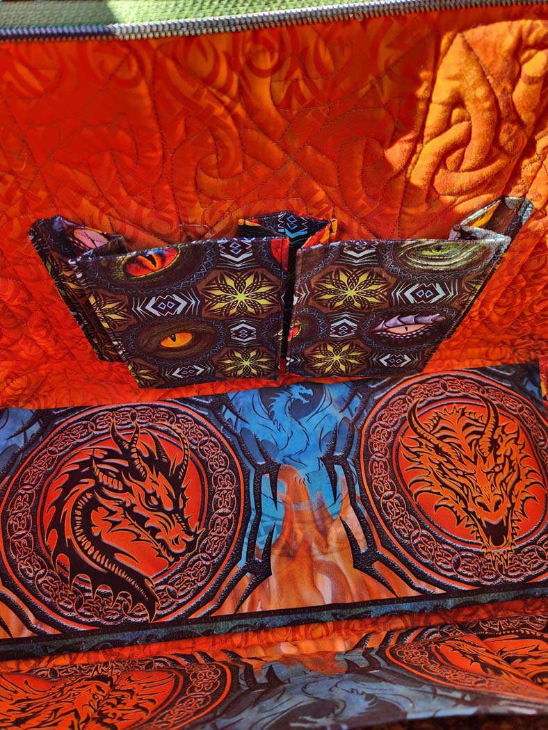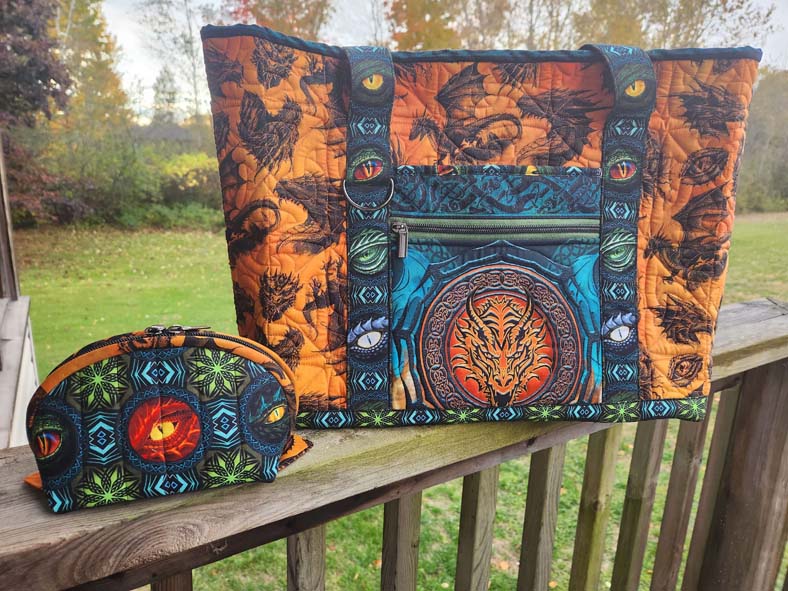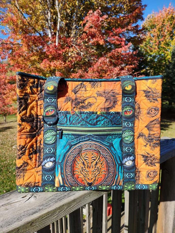 THEIR STORY: I have an amazing friend, who loves dragons, so I always look for things, dragon related. My local quilt shop posted photos of some of this line and when I saw the dragon eyes, I knew it would be perfect for the handles on the Two Big Totes, size large.