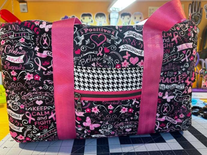 After a dear friend was diagnosed with breast cancer, one of the ways she chose to fight back was by hosting a fundraiser each October to raise money for gift/treat/comfort bags for cancer patients undergoing treatment. Here’s my donation to the raffle-so proud to be asked to be a part of this project!