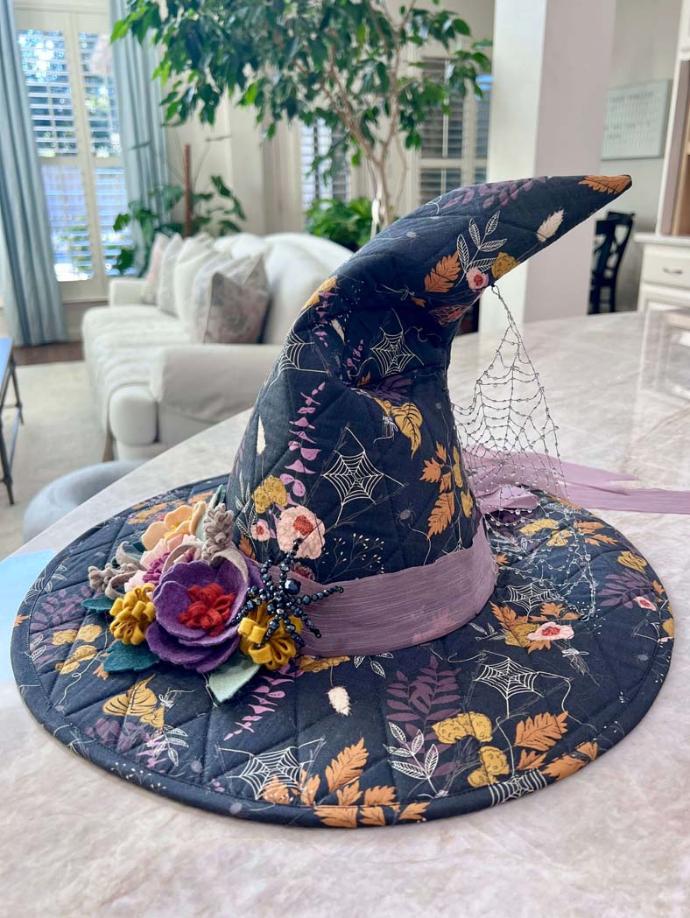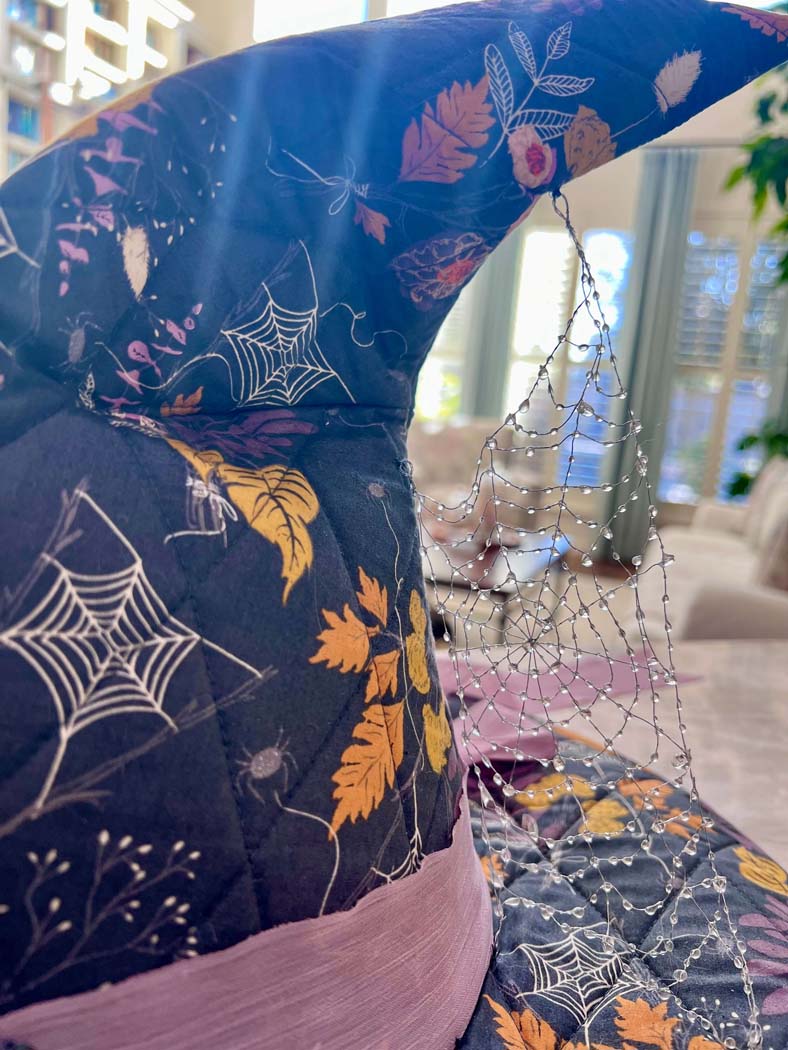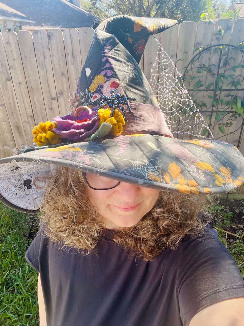 I made a few quilted witchy hats for family all the while thinking my way through how I would make one for myself that would combine the beautiful dewy web and spider with a crumpled quilted witch hat. Sunday I jumped into the project with both feet and went deep down the rabbit hole not stopping until I was done.