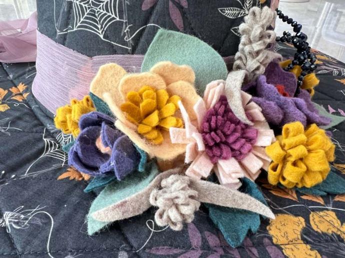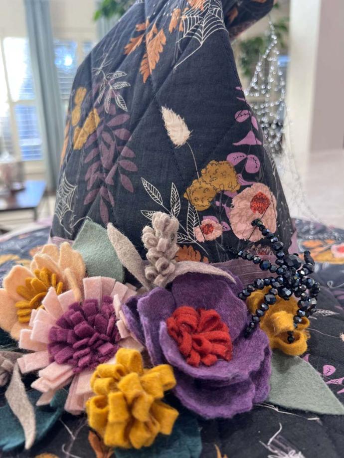 THEIR STORY: This hat is an amalgam of Quilted Witch’s Hat by Sew a Story and Wende Witch Hat by By the Bay Co. with a lot of modifications using techniques I learned making By Annie bags. I substituted By Annie Soft and Stable for traditional quilt batting so that the hat would have structure. The spiderweb and beaded spider were inspired by @threadhandedjill and the felt flowers patterns by @resacurbocreative