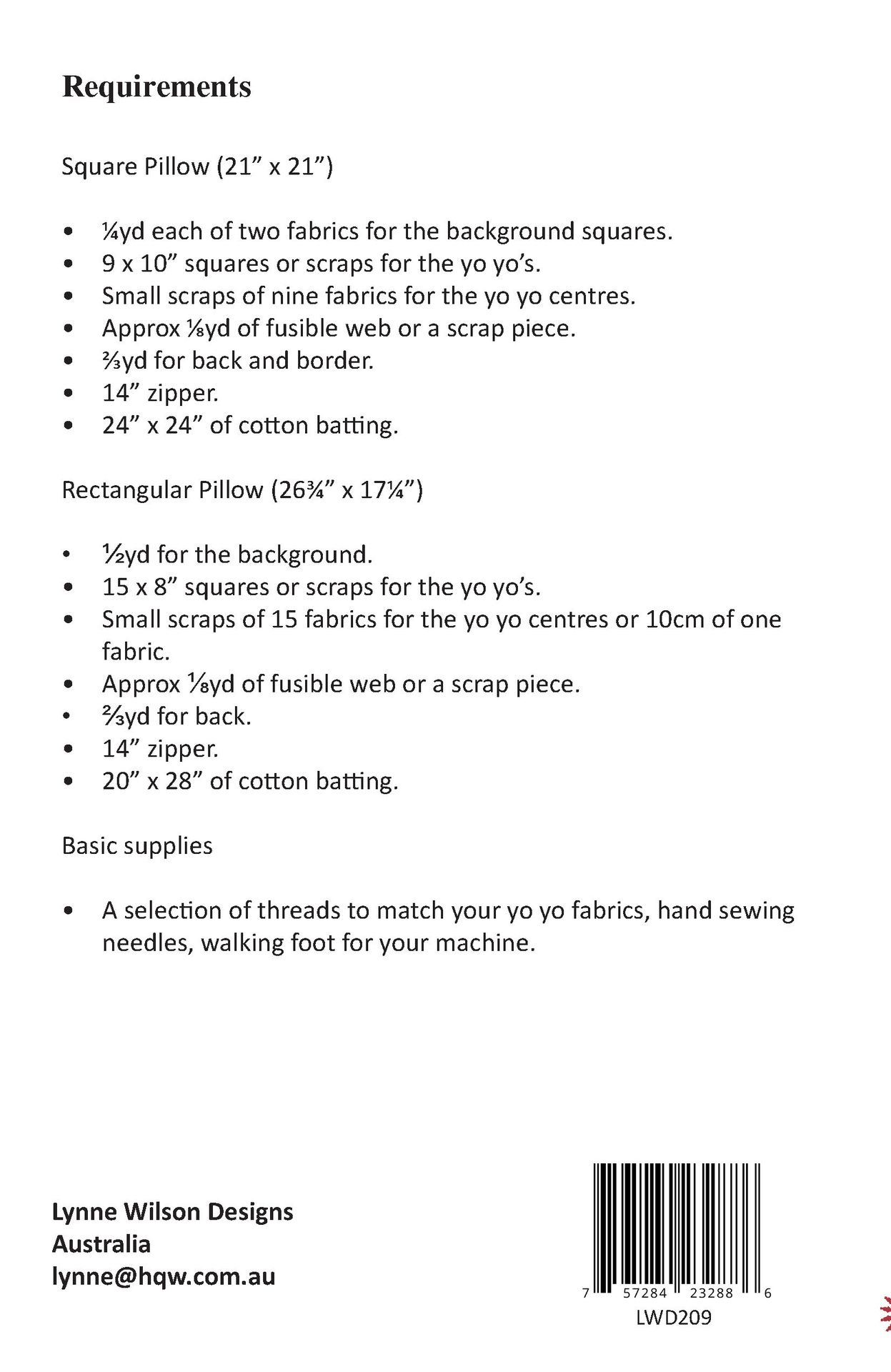 Choose contemporary fabrics for a modern take on traditional hand sewn yoyo’s. Create yoyo’s in two different sizes and complete the pillows with some simple machine piecing and quilting.